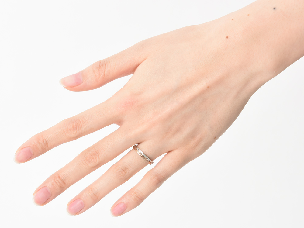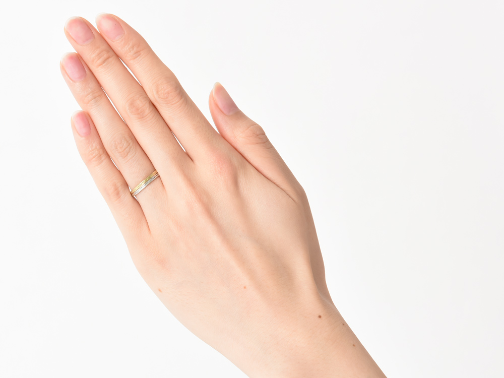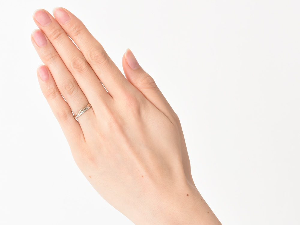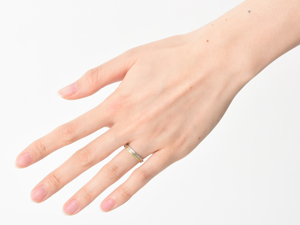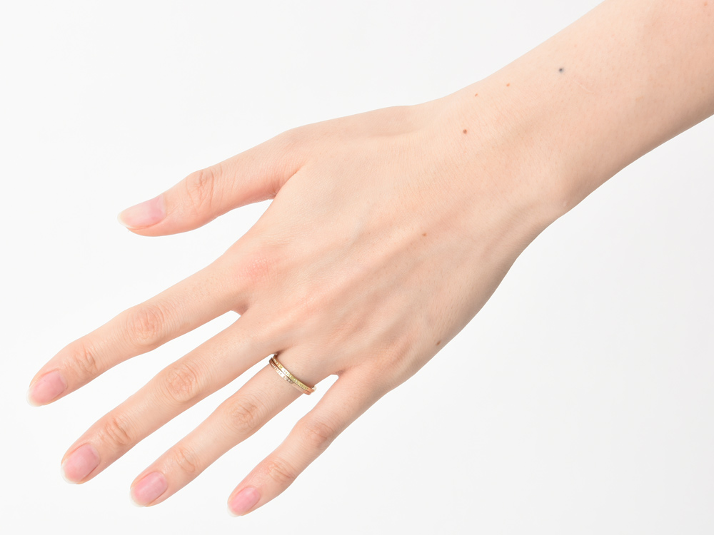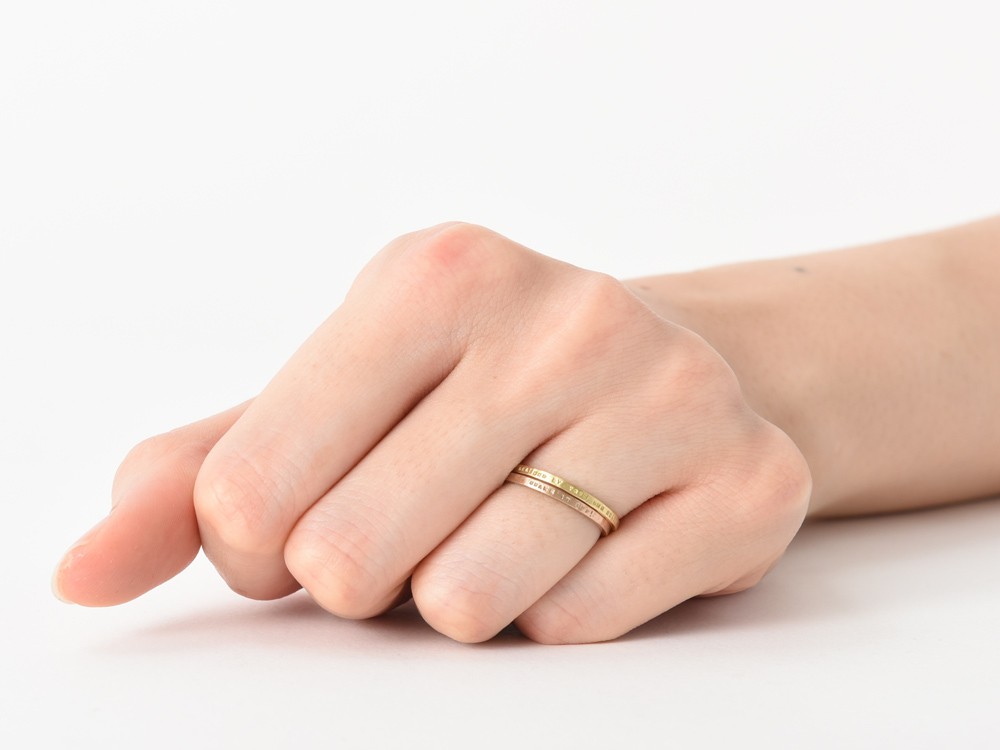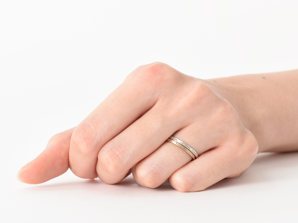 そのため、リング外側に刻印を打ち込んでいるにもかかわらず、1.4mmという驚くほど細いリング幅で、2本重ね着けしてもまったく窮屈さがありません。