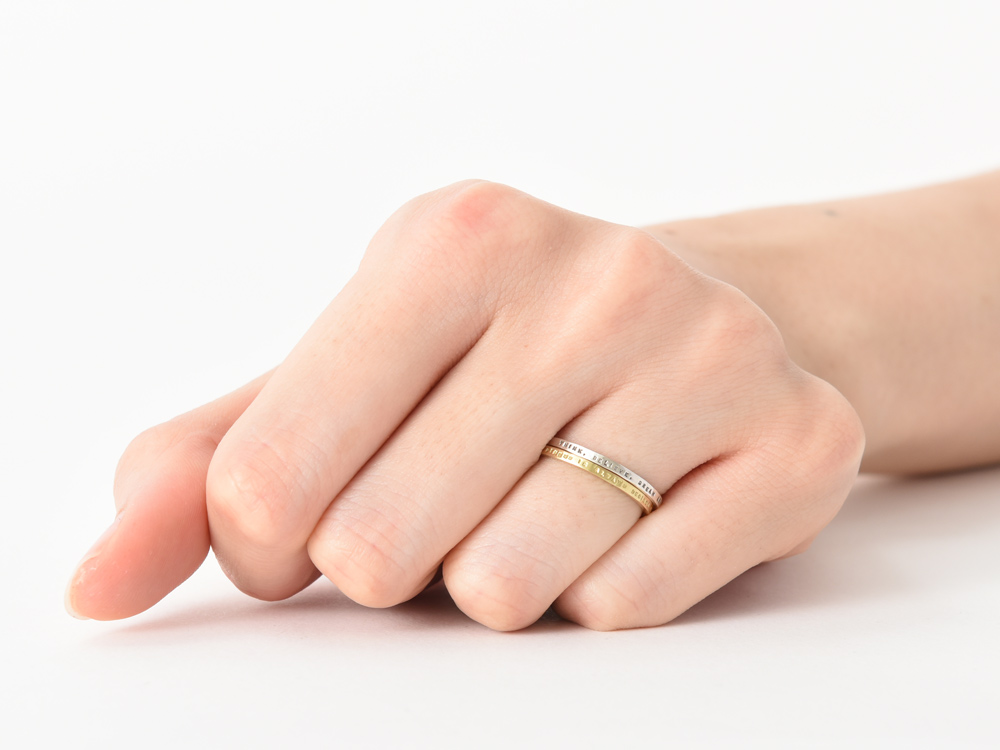 メッセージが刻印できる華奢で細身のシルバーリング(NR0009S)と同じデザインのK18ゴールドリング(NR009YG)を重ね着けした着用例です。