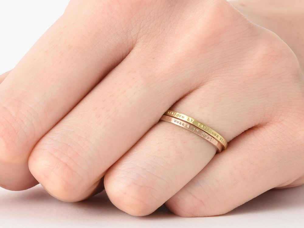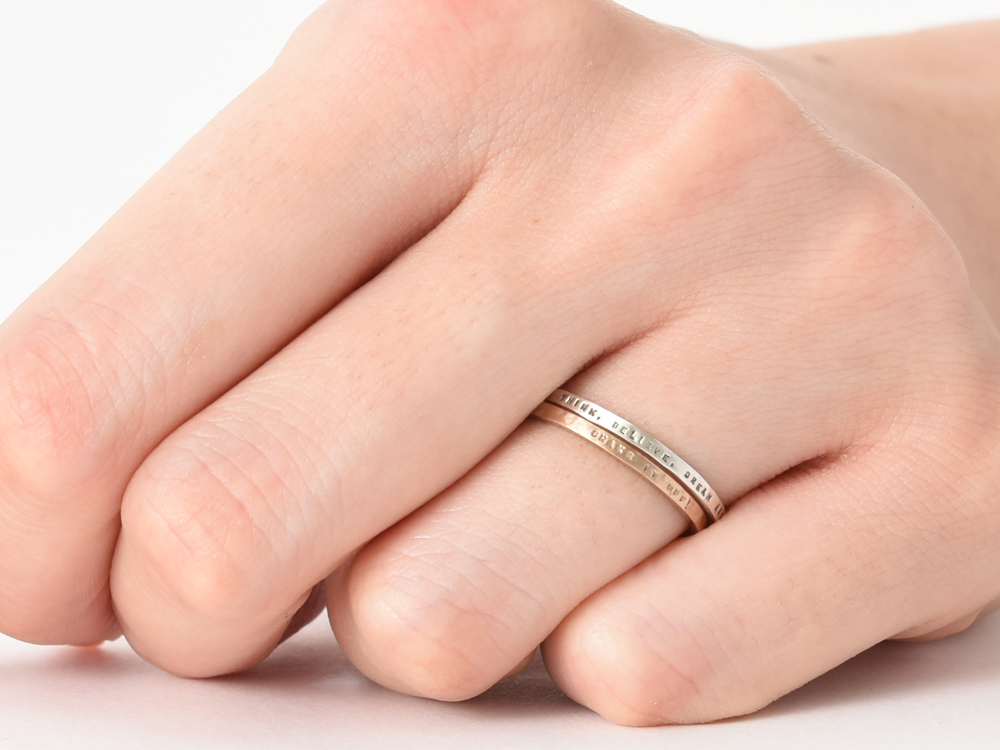 指輪のコーディネートとして、重ね着けなど複数のリングつけて楽しむのためにも、最適なのがメッセージが刻印できる華奢で細身のリングです。