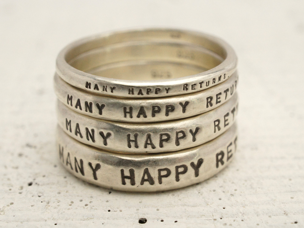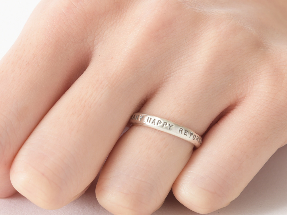 写真のシルバーリングの刻印は、MANY HAPPY RETURNS.(お誕生日おめでとう/多くの幸せが巡ってきますように)と刻まれています。