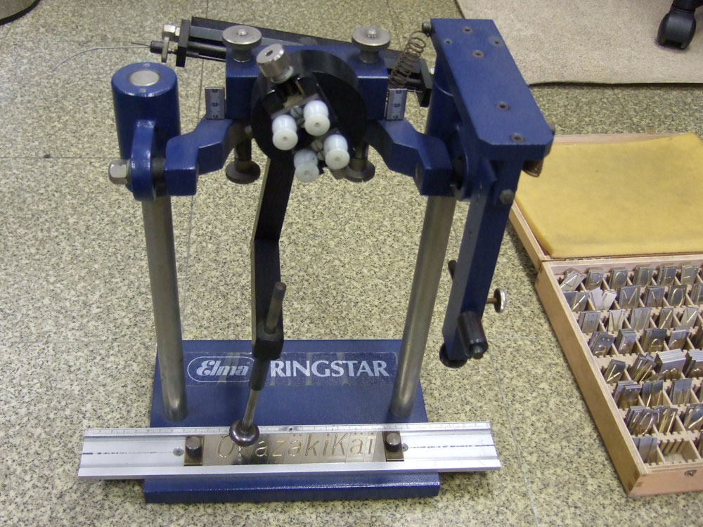 リング外側のメッセージは、職人が一文字づつ、写真のような「刻印」を使って入れています。