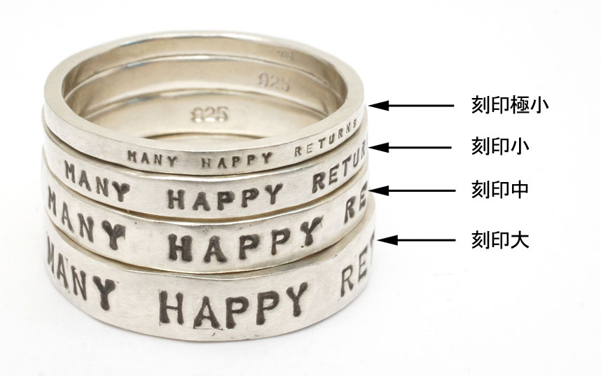 商品によって使う刻印の大きさを変えています。同じ1行タイプのリングでも、幅の広いリングは大きな刻印を使い、幅のせまいリングは、小さな刻印を使います。
